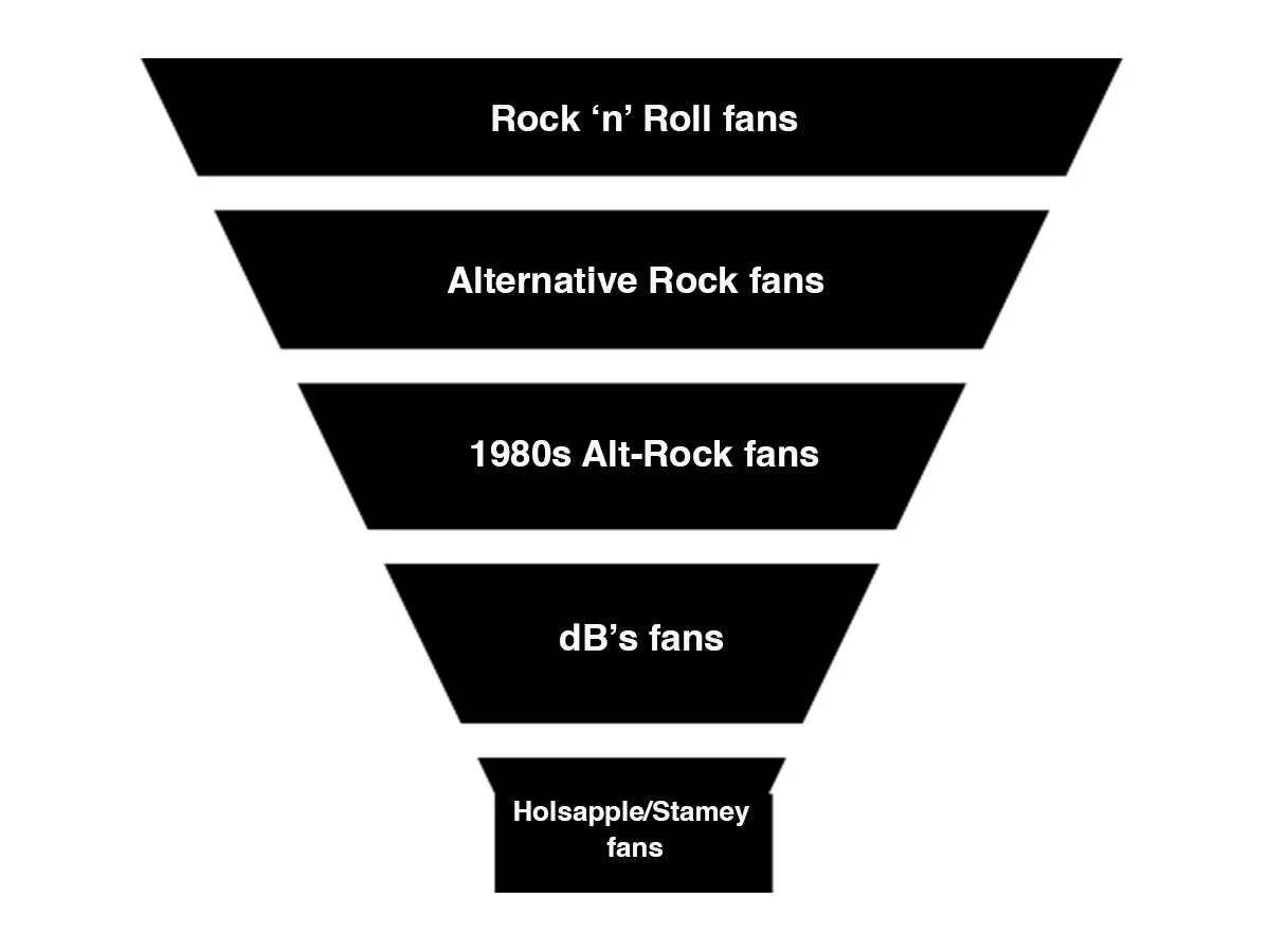 As you can see, the mouth of the funnel is pretty wide, as it includes fans of every conceivable rock era and subgenre. You could target this group, but your audience will likely be in the hundreds of millions (what marketers call “spray and pray.”) From there, we narrow to alternative rock, which would include the bands mentioned earlier, but also alt-rock bands from the ‘90s and beyond — still pretty broad. Move down another layer, and we've narrowed to 1980s alt-rock fans. A little more specific, but it still includes fans of any of the bands mentioned. The next step would be dB’s fans, followed by the most specific audience, fans of the artists themselves.
