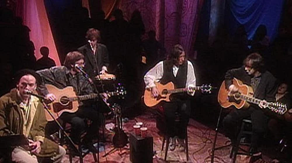 R.E.M. on MTV Unplugged, 1991. L to R: Michael Stipe, Mike Mills, Bill Berry, Peter Buck, and Peter Holsapple.